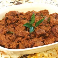 - After the pressure releases from the cooker remove the lid and add the rest of the oil and let the water evaporate. Fry the meat in low flame. At this point, you may add the curry leaves to your preference, however, the curry leaves are more for presentation than for taste. Fry till the oil separates from the sides.